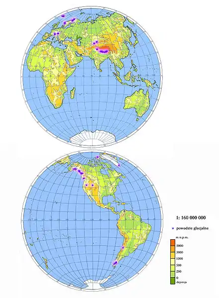 Whilst jökulhlaups were originally associated with Vatnajökull, they have been reported in the literature over a broad range of locations including the present day Antarctic, and there is evidence that they also occurred in the Laurentian ice sheet[9][10][11][12] and the Scandinavian ice sheet during the Last Glacial Maximum.[13]
