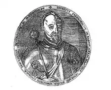 Jürgen von Farensbach [1] (1551–1602) (Russian: Юрий Францбек, Danish: Georg Farensbach, Polish: Jerzy Farensbach) was a Baltic German nobleman and Livonian general. Sent as the Ambassador of Livonian Confederation to Czar Ivan IV of Russia, for concluding a peace treaty, he entered the Russian service and won the battle on Oka against the Tatars on August 1, 1572. Later he served in the Danish and Polish armies. In 1586 Farensbach gained the rank a senator of the Polish crown granted by Sigismund III, whom he had assisted in gaining the throne of Poland. As field marshal of Poland he fought against the Swedish Empire, where he was killed in the attack on the castle of Fellin on May 17, 1602.[2]