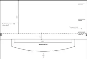 A 61-foot-wide orchestra pit curves out 12 feet into the house from the downstage end of the stage. This curves down along a 100 foot radius to 6 feet, 9 inches at the left and right ends. The height of platforms in the pit can be adjusted to be either: a) 18 inches below the house floor, b) level with the house floor, or c) raised to act as an apron extension at stage height. On the stage, 9' 9" wide floor panels can be arranged to create a 19 foot tall orchestra shell. 4 additional flown sound panels complete an on-stage acoustic accommodation. The Collins Center also contains one 9-foot grand piano in its inventory.