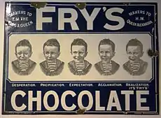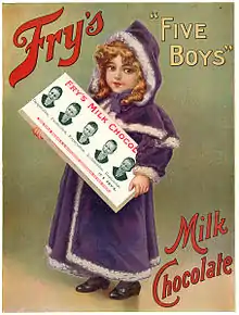 In April 2020 an original enamel advertising sign with the distinctive "five boys" trademark design was featured on BBC's Antiques Roadshow and was valued at £1,000-£1,500.[12] The boy featured in the design, Lindsay Poulton, had been photographed in 1886 by his father who, for the first image, soaked a cloth in ammonia and wrapped it round the boy's neck to make him cry. Poulton, in his eighties, related this story to Fry's employees when he was given a tour of the Bristol factory.[13]