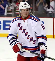 Miller joined the Rangers organization for the 2012–13 season. After beginning the season with the Connecticut Whale of the AHL, Miller was recalled by the Rangers on February 5.[8] On February 7, he recorded his first two career NHL goals, against Evgeni Nabokov of the New York Islanders in a 4–1 win.[9][10] After the Whale season concluded, Miller was added to the Rangers' 2013 playoff roster, but did not play in a game.[11]