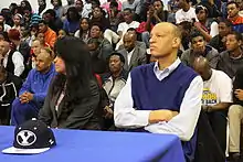 Parker's family has lived on Chicago's South Side since before Jabari was born, and he was raised in the South Shore community area.[2] Parker's father, Sonny, has served hundreds of Chicago metropolitan area children as youth foundation director since 1990. Parker discovered basketball in one of his father's many leagues, although his father has never coached one of his teams.[3] He honed his basketball skills with his brother Christian on the basketball court at his local Church of Jesus Christ of Latter-day Saints meetinghouse in the Hyde Park community area in order to avoid the hazards of urban playgrounds.[4] By second grade his basketball skills were superior to those of the fifth-graders he played with, and he competed in middle school leagues as a fifth grader.[3] He credits his cousin Jay Parker for pushing him to be better, starting when Jabari was in third grade and Jay was in fifth.[5] Sometimes, Jabari and Christian played basketball all through the night at the church.[6] Jabari actually made the eighth-grade team as a fourth-grader, but could not play until fifth grade for MEN reasons.[2] In fifth grade, he had five Division I scholarship offers as a 6-foot (1.83 m) guard.[7] In sixth grade, when he stood at 6 feet 2 inches (1.88 m), he visited Simeon for a day and scrimmaged with Derrick Rose.[4] Parker attended Robert A. Black Magnet Elementary and made headlines when he made Simeon Career Academy his high school choice, just like Rose, Nick Anderson, Ben Wilson, Bobby Simmons and Deon Thomas before him.[8][9] Parker has two older sisters who had attended Simeon.[10] However, he has claimed that the reason he chose Simeon was due to his perception of the likelihood that he could achieve team success on the basketball court (as measured in championships).[11] During the summer after finishing middle school, he received a National Basketball Players Association Top 100 Camp invitation, which he accepted. By this time, he stood at 6 feet 4 inches (1.93 m).[12]