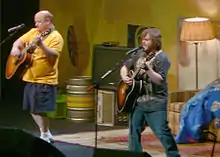 Black is the lead singer and guitarist for the comedy rock/hard rock band Tenacious D along with Kyle Gass.[42] They have released four albums, a self-titled debut, The Pick of Destiny, Rize of the Fenix, and Post-Apocalypto. One of their songs from their album The Pick of Destiny, titled "The Metal," was used in the music video games Guitar Hero III: Legends of Rock[43] and Brütal Legend.[44] "Rock Your Socks," from the album Tenacious D, was played in the music video game Rock Band Unplugged as well.[45] "Master Exploder" from The Pick Of Destiny went on to be used in music video games Guitar Hero Van Halen, Rock Band 2, and Brütal Legend, along with their song "Tribute" from Tenacious D. "Master Exploder" and "The Metal" featured in the comedy film Tenacious D in The Pick of Destiny. The film, directed by Tenacious D veteran Liam Lynch, featured recurring characters from Black's comedy such as Lee the super-fan and the Sasquatch. Several celebrities had roles in the film; actor Tim Robbins cameos as does Dave Grohl as Satan. Ben Stiller also makes an appearance as a worker at a Guitar Center, even having a role in the music video for "Tribute."
