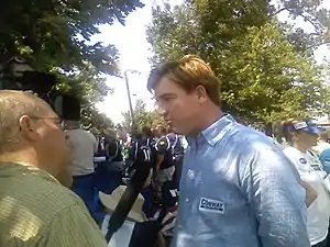 At the McCracken County Democratic Executive Committee's annual Alben Barkley Dinner, Conway and Mongiardo began making their cases for the nomination, with Mongiardo touting his experience as a medical doctor and emphasizing the importance of health care in the national dialogue and Conway countering that he would be able to address a broader range of issues as a senator.[88] A further contrast came to light in July 2009 when Conway announced his support for the proposed American Clean Energy and Security Act, which would have created a system of emissions trading in the United States, but qualified his support by saying the bill should include language to protect affected consumers and businesses; Mongiardo called the bill a "terrible piece of legislation".[85] The bill became an issue at the annual political picnic at Fancy Farm, Kentucky, with Mongiardo calling on Conway to condemn the legislation and Paul telling the crowd that "[Conway is] kind of against it a little bit and he's kind of for it a little bit".[89][90] Following the event, The Washington Post's Chris Cillizza, moved the primary between Conway and Mongiardo from seventh to fifth in his list of the ten most competitive primaries in the nation.[91] In October 2009, Conway announced his opposition to the Clean Energy Jobs and American Power Act, the Senate version of the emissions trading bill sponsored by Democratic Senators John Kerry (D-MA) and Barbara Boxer (D-CA).[92]