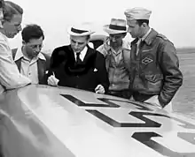 The Group's aim was to find a replacement for black-powder rocket motors—units consisting of charcoal, sulfur and potassium nitrate with a binding agent. The mixture was unstable and there were frequent explosions damaging military aircraft.[72] The solid JATO fuel invented by Parsons consisted of amide, corn starch, and ammonium nitrate bound together in the JATO unit with glue and blotting paper. It was codenamed GALCIT-27, implying the previous invention of 26 new fuels. The first JATO tests using an ERCO Ercoupe plane took place in late July 1941; though they aided propulsion, the units frequently exploded and damaged the aircraft. Parsons theorized that this was because the ammonium nitrate became dangerously combustible following overnight storage, during which temperature and consistency changes had resulted in a chemical imbalance. Parsons and Malina accordingly devised a method in which they would fill the JATOs with the fuel in the early mornings shortly before the tests, enduring sleep deprivation to do so. On August 21, 1941, Navy Captain Homer J. Boushey, Jr.—watched by Clark Millikan and William F. Durand—piloted the JATO-equipped Ercoupe at March Air Force Base in Moreno Valley, California. It proved a success and reduced takeoff distance by 30%, but one of the JATOs partially exploded.[73] Over the following weeks 62 further tests took place, and the NAS increased their grant to $125,000. During a series of static experiments, an exploding JATO did significant damage to the rear fuselage of an Ercoupe; one observer optimistically noted that "at least it wasn't a big hole", but necessary repairs delayed their efforts.[74]