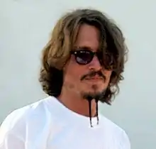 Depp wears a dreadlock wig in a rock-and-roll approach to a pirate aesthetic.[30] He wears a red bandanna and numerous objects in his hair, influenced by Keith Richards' habit of collecting souvenirs from his travels;[31] Sparrow's decorations include his "piece of eight".[32] Sparrow wears kohl around his eyes, which was inspired by Depp's study of nomads, whom he compared to pirates,[33] and he wore contacts that acted as sunglasses.[34] Sparrow has several gold teeth, two of which belong to Depp,[35] although they were applied during filming. Depp initially forgot to have them removed after shooting The Curse of the Black Pearl,[36] and wore them throughout the shooting of the sequels.[2] Like all aspects of Depp's performance, Disney initially expressed great concern over Depp's teeth.[6] Sparrow wears his goatee in two braids. Initially wire was used in them, but the wires were abandoned because they made the braids stick up when Depp layed down.[37] Sparrow has numerous tattoos,[32] and has been branded a pirate on his right arm by Cutler Beckett,[38] underneath a tattoo of a sparrow.[39]