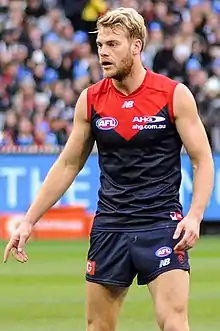 Watts' positive form was especially apparent in the thirty-five point win against Collingwood at the MCG in round four where he recorded seventeen disposals, eight marks and an equal career-high four goals[153] to receive the maximum three Brownlow votes.[154] The head of football writer at the Herald Sun, Mark Robinson, also attributed his consistency to stability in his position—whereas in previous years he was moved around the ground, even multiple times during a match—he was now used as a permanent forward playing alongside Jesse Hogan.[155] With the late withdrawal of Cameron Pedersen from the team in the sixty-three point victory over Brisbane at the MCG in round nine, Watts was forced to play as the back-up ruckman, which further proved his versatility; the move surprised onlookers, but he was praised by the media, particularly by Fox Sports Australia journalist, Sarah Olle, who noted his athleticism led to a "surprisingly good" result.[156] Being in career best form according to the media,[157][158][159] Watts signed a three-year contract extension in July, tying him to the club until the end of the 2019 season.[160]