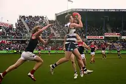 Watts maintained a spot in defence and was praised for his efforts there by the media;[88][89] in the three-week period following his return to the AFL side, he ranked first in the league for intercept marks and intercept possessions, and second in rebound-50s.[90] He played particularly well in the six point win against the second-placed team, Essendon, in round ten where he recorded twenty-four disposals, seven marks, seven rebound-50s and four tackles to earn three Brownlow votes, thereby being adjudged the best player on the ground by the field umpires.[91][92] Three weeks later, he played his fiftieth AFL match in the seventy-eight point win against Greater Western Sydney at the MCG in round thirteen.[93] After playing every match from rounds eight to fifteen, he was forced to miss five weeks of football due to an ankle injury;[94] he returned for the twenty-five point win against Greater Western Sydney at Manuka Oval in round twenty-one,[95] to play the remainder of the season and finish with fifteen games in total.[96]