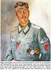 - Georg-Woldemar-Ewert von Renteln, Major von Rentlen, born to a landowning family on 10.04.1893, Kirchspiel Weißenstein (Prääma)/Gut Bremerfeldt, Järvamaa County/Kreis Jerven, Estland/Estonia, served as a lieutenant in the Tsarist Guard regiment Garde du Cheval during World War I. The Bolshevik Revolution took all his assets. Joined German army as ordinary German volunteer in 1939. Described as having 'been burned by the sun and from the cold winter of winter. This great man, whom the struggle for Bolshevism has become a life-affair (or destiny), is trusted blindly by the Cossacks who have not left him at any difficult moment.' He died in Soviet captivity, January 9, 1947.