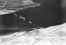 On October 17, 1925, a ferry service was opened between Barren Island, Brooklyn (later Floyd Bennett Field airport) and Riis Park.[38] In 1926, a short macadam transverse road was created between Washington Avenue and the ferry terminal.[10]:41 The road was later paved with concrete, and expanded from 20 feet (6.1 m) wide to 40 feet (12 m) wide.[39]:14 A small concession stand was also constructed at the west end of the park.[10]:41–42 From 1926 to 1927, the beach protection system was expanded to the western section of the park, with additional groins installed.[10]:42–43 From 1927 to 1929, Washington Avenue was widened and paved, with a sidewalk added to both Washington Avenue and the ferry transverse road. Other minor improvements to the park took place at this time.[10]:43[40]:13, 32–33 In July 1929, an existing 1,000-car parking lot was enlarged. By this time, the patronage of Jacob Riis Park was increasing.[10]:45–46[41] Meanwhile, in 1929 the New York City Board of Transportation released a major expansion plan for the New York City Subway. One of the new routes in the plan involved recapturing the New York, Woodhaven and Rockaway Railroad, which by this time became the Rockaway Beach Branch of the Long Island Rail Road, and extending it as a subway line west from Rockaway Park to Jacob Riis Park. The extension of the line to the park was never constructed.[42][43][44]
