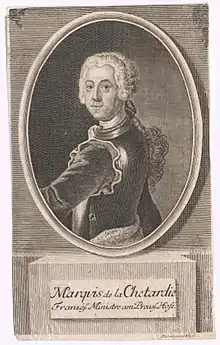 Jacques-Joachim Trotti, marquis de La Chétardie (3 October 1705 – 1 January 1759) was a French diplomat who engineered the coup d'etat that brought Elizaveta Petrovna to the Russian throne in 1741. In the course of his eventful career, La Chetardie was sent on diplomatic errands throughout Europe: in London (1727), then in Holland and Prussia, in Russia twice, and finally in Turin in 1749 in the company of Jean-Louis Favier.