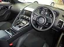The interior of the F-Type has a two-seater setup with the leather upholstery and control buttons finished in aluminium. There is a touchscreen display in the centre console and another TFT display between the dials in the instrument panel. There is also a choice of flat-bottom or Alcantara finish for the three-spoke steering wheel and buttons finished in soft-feel matte black.[27]