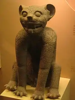 The representation of jaguars in Mesoamerican cultures has a long history, with iconographic examples dating back to at least the mid-Formative period of Mesoamerican chronology. The jaguar (Panthera onca) is an animal with a prominent association and appearance in the cultures and belief systems of pre-Columbian Mesoamerican societies in the New World, similar to the lion (Panthera leo) and tiger (Panthera tigris) in the Old World.[1] Quick, agile, and powerful enough to take down the largest prey in the jungle, the jaguar is one of the biggest felids in Central or North America,[2] and one of the most efficient and aggressive predators. Endowed with a spotted coat and well adapted for the jungle, hunting either in the trees or water, making it one of the few felines tolerant of water, the jaguar was, and remains, revered among the indigenous Americans who live closely with the jaguar.