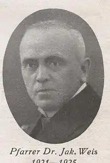 Jakob Weis (13 May 1879, Ommersheim, Saarpfalz - 18 March 1948, Zweibrücken) was a priest in the Diocese of Speyer, who also worked as a prison chaplain. During the First World War he became the army chaplain to the 12th Bavarian Infantry Division and Catholic pastoral care advisor to the Armee-Oberkommando Mackensen. From 1918 to 1920 he voluntarily joined soldiers in their internment so as to continue his pastoral care.