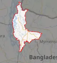 Jamalpur occupies 2031.98 km2.[2] It is located between 24°34' and 25°26' North and between 89°40' and 90°12' East. It shares an international border with the Indian state of Meghalaya in the North East. It is surrounded by Kurigram and Sherpur districts in the North, Tangail district in the South, Mymensingh and Sherpur districts in the East, Jamuna River, Bogra, Sirajganj and Gaibandha districts in the West. The main town is situated on the bank of the river Brahmaputra, 140 kilometres (87 mi) north of Dhaka, the national capital.