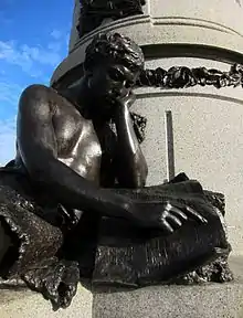 The monument includes three allegorical figures spread around the base representing three significant periods in Garfield's life. The first is the Student, reminding us of his time as an educator, the next is the Warrior, commemorating his service during the Civil War and the third is the Statesman, pointing to his career as a public servant.[3]