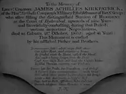 Lieutenant-Colonel James Achilles Kirkpatrick (1764 – 15 October 1805) was the British Resident at Hyderabad from 1798 to 1805. He also built the historic Koti Residency in Hyderabad, a landmark and major tourist attraction.