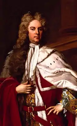 James Brydges, 1st Duke of Chandos, PC DL FRS (6 January 1673 – 9 August 1744) was a British landowner and politician who sat in the English and British House of Commons from 1698 until 1714, when he succeeded to the peerage as Baron Chandos, and vacated his seat in the House of Commons to sit in the House of Lords. He was subsequently created Earl of Carnarvon, and then Duke of Chandos in 1719.[1]