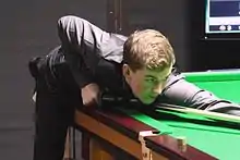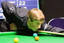 Cahill's second season saw him improve his results as he twice reached the last 32 in the minor-ranking European Tour events.[10] At 18-years-old, he then went on his best run to date in a ranking event during the 2014 UK Championship. He won comfortably in the first round, beating veteran Mark King 6–0 and then saw off former Welsh Open finalist Andrew Higginson 6–4.[11] Cahill faced world number three Ding Junhui, a player who had won five ranking titles the previous season, and raced into a 5–1 lead. Ding won three frames in a row and needed three snookers in the next frame, which he got when Cahill left a free ball. Cahill responded by taking the deciding frame to record the biggest victory of his career up to that point.[12]