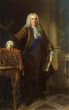 He retired from Parliament in 1747 and little is known of his life after this, although Dutch author Isabelle de Charrière records meeting him during her visit to London in 1766.[14] When his brother George died in 1770, he replaced him as Governor of Chester but normally resided at Carrington House, in Mayfair. He died on 13 October 1775 and was buried in Westminster Abbey, near his uncles Robert and Richard, who died in 1678 and 1680 while pupils at Westminster School.[15]