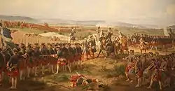Promoted Brigadier-General in July, his regiment was among the reinforcements sent to Britain in November during the 1745 Rising and served in Scotland under Henry Hawley. In early January 1746, the Jacobites besieged Stirling Castle; on 13th, Hawley ordered 4,000 men under Cholmondeley and John Huske north to Falkirk to relieve it, following himself with another 3,000 men. The Battle of Falkirk began late in the afternoon of 17 January in failing light and was marked by confusion and command failures on both sides.[11] A violent snow storm broke out as the regiments deployed, making co-ordination extremely difficult; the government left was routed but Cholmondeley's brigade on the right held their ground and prevented a major Jacobite success.[12]