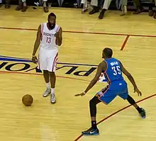 On January 19, 2015, Harden set a new season high with 45 points against the Indiana Pacers.[29] He tied that mark with 45 points against the Trail Blazers on February 8, 2015.[29] On February 23, 2015, he recorded his second triple-double of the season with 31 points, 11 rebounds and 10 assists in a 113–102 win over the Minnesota Timberwolves.[30] On March 6, 2015, he recorded his third triple-double of the season with 38 points, 12 rebounds and 12 assists in a 103–93 win over the Detroit Pistons.[31] On March 19, 2015, he scored a career-high 50 points against the Denver Nuggets.[29] He topped that mark with 51 points against the Kings on April 1, 2015.[29] It was his 33rd 30-point game of the season and his ninth 40-point game of the season. He became the first player in franchise history to have two 50-point games in a season.[32] Four days later, he had 41 points against the Oklahoma City Thunder for his 10th 40-point game of the season.[29] In the Rockets' regular season finale on April 15, Harden recorded his fourth triple-double of the season with 16 points, 11 rebounds and 10 assists in a 117–91 win over the Utah Jazz. He helped the Rockets win their first division title since 1994 and clinched the No. 2 seed in the Western Conference.[33] Harden was again named to the All-NBA First Team,[34] and finished second in the NBA MVP voting behind Stephen Curry.[35] Harden was later voted the inaugural National Basketball Players Association's MVP for the 2014–15 season.[36]