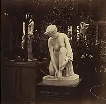 Unlike many of his contemporaries, Pradier oversaw the finish of his sculptures himself. He was a friend of the Romantic poets Alfred de Musset, Victor Hugo, Théophile Gautier, and the young Gustave Flaubert, and his atelier was a center, presided over by his beautiful mistress, Juliette Drouet, who became Hugo's mistress in 1833. After the liaison with Drouet ended, he married Louise d'Arcet (1814-1885), daughter of the French chemist Jean-Pierre-Joseph d'Arcet, in 1833 but they would separate in 1845,[1] after Pradier had become aware of her infidelities.[2] They had three children: Charlotte (born 27 July 1834), John (b. 21 May 1836), and Thérèse (b. 3 July 1839.). Due to her numerous lovers and her complicated financial lfe, Louise Pradier was among the inspirations for Flaubert when he wrote Madame Bovary.[3]