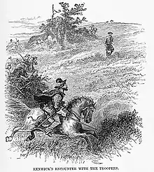 James II's Scottish proclamations of indulgence (12 Feb. and 28 June 1687) gave full liberty for presbyterians to assemble for their worship in meeting-houses or private residences, on condition of registration and taking an oath of allegiance. Field conventicles were still prohibited. The conditions were satisfactory to all but Renwick and his followers, who would acknowledge no royal prerogative of dispensation, and insisted on maintaining their field-meetings. On 5 October a proclamation ordered the utmost severity against such meetings; and on 18 October a reward of 100/. was offered to any one who would deliver up Renwick, dead or alive. His friends must have been very faithful to him, for he made his way about the country, and, narrowly escaping arrest at Peebles, reached Edinburgh, where he lodged a protest against the indulgence with Hugh Kennedy, moderator of the Edinburgh presbytery, and afterwards got it promulgated. At the end of the year he preached for several Sundays in Fifeshire; on 29 January 1688 he preached for the last time at Borrowstounness. Returning to Edinburgh, he lodged on the night of 31 January at a smuggler's receiving house on the Castlehill. A customs officer, John Justice, who was watching the house, heard him at family prayer, and suspected who it was. Next morning (1 Feb.) Justice surprised him and endeavoured to effect his arrest. Renwick defended himself with a pistol, and got away to the Castlewynd in the Cowgate, where he was seized and taken to the Tolbooth.[6]