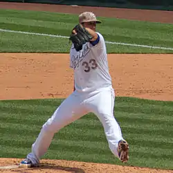 Shields threw a changeup 26.3% of the time in 2008, tops in the AL.[12] Shields became the first winning pitcher in a postseason game in the history of both the Rays and Tropicana Field when the Rays beat the Chicago White Sox in Game 1 of the 2008 ALDS.[13][14] He is the first—and as of 2016, the only—Tampa Bay Rays pitcher to win a World Series game,[15] having done so in Game 2 of the 2008 World Series. The Rays ended up losing the series to the Philadelphia Phillies within 5 games. Shields led the Rays in innings pitched in 2008 with 215, and also tied Edwin Jackson to lead the Rays with 14 wins, which also tied the record for most wins by a Rays pitcher.[16]