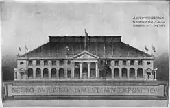 A controversial feature of the exposition was its "Negro Building", designed by W. Sydney Pittman, which displays showed the progress of African Americans. The exhibit was charged with being a "Jim Crow affair", and criticized by prominent figures like W. E. B. Du Bois who voiced his complaint in Appeal to Reason, a Socialist newspaper. However, other blacks saw the Negro Building as an achievement. The organizer Giles B. Jackson felt that having the exhibition in a separate Negro Hall allowed for a greater variety and completeness of presentation, and that it could better highlight the achievements of African Americans as African Americans. He said a separate building demonstrated black "capacity as a producer and the maker of anything and everything that has been made by other races."[3] For fairgoers sharing his opinion, many of whom were middle-class Southern blacks, the Negro Building represented an achievement that few Southern whites would have thought possible: the building was architecturally elegant, designed and built by blacks, with funds raised by blacks. A series of dioramas by Meta Vaux Warrick Fuller, a black woman artist from Philadelphia, comprised the first artwork done by an African American with federal funds.[3]