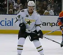 Jamie Randolph Benn[1] (born July 18, 1989) is a Canadian professional ice hockey winger and captain of the Dallas Stars of the National Hockey League (NHL). Benn played his junior hockey career with the Kelowna Rockets of the Western Hockey League (WHL) prior to turning professional. He represented Canada at the 2009 World Junior Championships, where he helped capture a gold medal. With Team Canada, he won a gold medal at the 2014 Winter Olympics in Sochi, Russia. He is the younger brother of defenseman Jordie Benn, who plays for the Vancouver Canucks, and is a former teammate of Jamie's.[2] In the 2014–15 season, Benn was awarded the Art Ross Trophy as the league's leading scorer with 87 points.