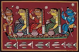 • "Ramayana", 1946, Spread across 17 canvases (106 × 76 cm, each) Roy's Ramayana is considered to be his magnum opus. Patronized by Sarada Charan Das, Roy created this masterpiece series in Kalighat pata style with natural colors, using earth, chalk powder and vegetable colors instead of dyes. Later Roy also created individual replicas capturing various moments from the entire series. Some of these paintings have been preserved in the National Art Gallery of India and are also in display in the Victoria Memorial Hall. His story of Ramayana begins with sage Valmiki and completes the circle back to his hermitage after Sita's aagnipariksha. All his 17 canvases are frequently characterized by decorative flowers, landscape, birds and animals typical of the Bengal School of Art. His lines are simple, bold and roundish initially derived from clay images but they lead to complex moments rendering subtle yet powerful emotions. Jamini Roy's complete “Ramayana” is on display today at Sarada Charan Das' residence "Rossogolla Bhavan" in Kolkata along with 8 other large-scale originals. The Das residence today harbors the largest private collection of Jamini Roy paintings with 25 of the master's originals.[9]
