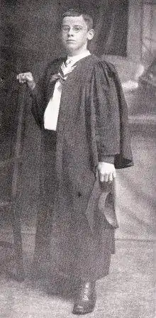 Jan was first educated at the illustrious South African College Schools, which he entered in January 1902. A child prodigy, he progressed rapidly through its grades so that he matriculated four years later in 1906. He went on to study classics at the University of Cape Town (then still known as the South African College) and in 1909 graduated B.A. with first-class Honours at the age of 15.[4] At this time he was awarded a Rhodes Scholarship to study at Oxford. He accepted the award but only made use of it a few years later when he was older. In the meanwhile he took another B.A. in the sciences in 1910 and an M.A. in classics in 1911, when he was just seventeen years old.[5] Apart from his studies, Hofmeyr also became active in the university's Debating Society (succeeding Oliver Schreiner as its president), worked as treasurer in its College magazine, and volunteered in its Students' Christian Association.