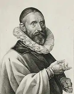 Sweelinck's only duties in Amsterdam were those of an organist.[16] Contrary to custom, he did not play the carillon or the harpsichord on formal occasions; nor was he regularly required to produce compositions. Calvinist services did not typically include organ playing due to the belief in what is now called the Regulative Principle. The Regulative Principle restricted the elements of worship to only that which was commanded in the New Testament. However, the Consistory of Dordrecht of 1598 instructed organists to play variations on the new Genevan psalm tunes before and after the service so that the people would become familiar with them.[17] Sweelinck was employed instead by the city itself. As he worked for Protestant magistrates the remainder of his life, it is likely that he was an adherent of Calvinism. In the 1590s three of his children were baptized in the Oude Kerk.[18] His employment allowed him time for teaching, for which he was to become as famous as for his compositions. Sweelinck's pupils included the core of what was to become the north German organ school: Jacob Praetorius II, Heinrich Scheidemann, Paul Siefert, Melchior Schildt and Samuel and Gottfried Scheidt.[19] Students of Sweelinck were seen as musicians against whom other organists were measured.[5] Sweelinck was known in Germany as the "maker of organists".[20] Sociable and respected, he was in great demand as a teacher.[21] His Dutch pupils were undoubtedly many, but none of them became composers of note. Sweelinck, however, influenced the development of the Dutch organ school, as is shown in the work of later composers such as Anthoni van Noordt. Sweelinck, in the course of his career, had set music to Catholic, Calvinist and Lutheran liturgies.[15] He was the most important composer of the musically rich "golden era" of the Netherlands.[5]