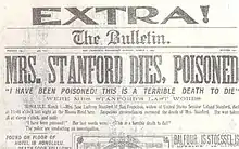 The San Francisco Evening Bulletin trumpeted the news with a March 1 headline, "Mrs. Stanford Dies, Poisoned."[10][16] Forensic chemical analysis revealed the presence of a pure form of strychnine in samples from the bicarbonate she had taken,[lower-alpha 6] as well as traces of the poison in her tissues.[10][12][lower-alpha 7] After hearing three days of testimony, the coroner's jury concluded in less than two minutes that she had died of strychnine "introduced into a bottle of bicarbonate of soda with felonious intent by some person or persons to this jury unknown."[12] The testimony revealed that the bottle in question had been purchased in California (after Richmond was let go), had been accessible to anyone in Stanford's residence during the period when her party was packing, and had not been used until the night of her death.[10][lower-alpha 8]