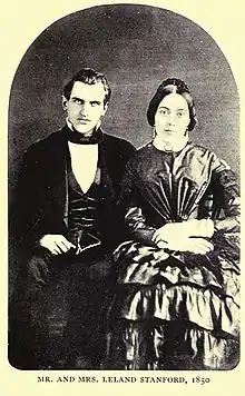 The Stanfords lived in Port Washington until 1852 when his law library and other property were lost to fire; they then returned to Albany. Leland Stanford went to California to join his brothers in mercantile businesses related to the California Gold Rush, while Jane remained in Albany with her family. He returned in 1855, and the following year they moved to San Francisco, where he engaged in mercantile pursuits on a large scale. Stanford was a cofounder of the Central Pacific Railroad, serving as its president from 1861 until his death in 1893. He was also president of the Southern Pacific Railroad from 1868 until ousted from the post by Collis Potter Huntington in 1890.[2](pp502-504 passim) Stanford also served as Governor of California from 1862 to 1863, and one of California's United States senators from 1885 until his death in 1893. After nearly 18 years of marriage, they finally had a child, a son, in 1868 when Jane Stanford was 39.[1]