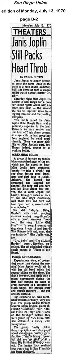 Despite Graham's announcement that the Fillmore West gig was Big Brother's last concert with Joplin, the band—with Joplin still as lead vocalist—toured the U.S. that fall. Reflecting Joplin's crossover appeal, two October 1968 performances at a roller rink in Alexandria, Virginia, were reviewed by John Segraves of the conservative Washington Evening Star at a time when the Washington metropolitan area's hard rock scene was in its infancy.[55] An opera buff at the time,[56] he wrote, "Miss Joplin, in her early 20s, has been for the last year or two the vocalist with Big Brother and the Holding Company, a rock quintet of superior electric expertise. Shortly she will be merely Janis Joplin, a vocalist singing folk rock on her first album as a single. Whatever she does and whatever she sings she'll do it well because her vocal talents are boundless. This is the way she came across in a huge, high-ceilinged roller skating rink without any acoustics but, thankfully a good enough sound system behind her. In a proper room, I would imagine there would be no adjectives to describe her."[55]