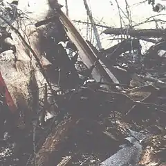 However, the aircraft was still in a 40° right-hand bank when the right-most #4 engine impacted into the trees on top of a ridge located 1.4 kilometres (0.87 mi) NNW of Mount Mikuni at an elevation of 1,530 metres (5,020 ft), which can be heard on the CVR recording. The backward shock of the impact, measuring 0.14G, in addition to losing the thrust of the 4th engine, caused the aircraft to bank sharply back to the right, and the nose to drop again. The aircraft continued on its trajectory for three seconds, upon which the right-wing clipped another ridge containing a "U-shaped ditch" 520 metres (1,710 ft) WNW of the previous ridge at an elevation of 1,610 metres (5,280 ft). This impact is speculated to have separated the remainder of the weakened tail from the airframe, as well as the remaining three engines, which were "dispersed 500-700 meters ahead";[3]:19, 91 after which the aircraft flipped on its back, impacted upon, and exploded on another ridge 570 metres (1,870 ft) NW from the second ridge, near Mount Takamagahara, at 6:56 p.m. The impact registered on a seismometer located in the Shin-Etsu Earthquake Observatory at Tokyo University from 6:56:27 as a small shock, to 6:56:32 as a larger shock, estimated to have been caused by the final crash. It is estimated that the shockwaves took approximately 2.0-2.3 seconds to reach the seismometer, making the estimated time of the final crash to be at 6:56:30 pm.[3]:108–109