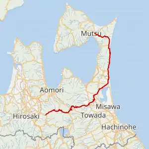 | Mutsu | Northern terminus; northern end of unsigned National Route 338 concurrency | ||||||