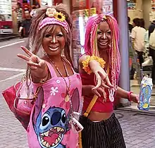 Ganguro and its predecessors can be said to be in direct opposition to both traditional conceptions of Japanese school children and Japanese women as meek, obedient, and undistracting, as well as in direct opposition to traditional Japanese ideals of beauty. Ganguro, as the Kogal culture before it, is an expensive fashion and requires much money to create the aesthetic.[2] More complexly, as a characterization of the affluent Californian valley girl, it may be meant to emanate an overall appearance of affluence and wealth. This may be considered as immodesty and selfishness, both of which are frowned upon in Japanese society.