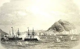 In February and March, the Union steam frigate Niagara and steam sloop Sacramento kept watch from a distance as Stonewall lay anchored off A Coruña, waiting for Stonewall to finish her repairs.[11] On 24 March Page put to sea, prepared to engage them, but the unarmored Union ships declined to fight. Stonewall steamed for Lisbon, Portugal, to re-coal,[12] intending to cross the Atlantic Ocean from there. Stonewall reached Nassau, Bahamas, on 6 May and then sailed on to Havana, Cuba, where Page learned of the war's end when he arrived five days later.[14]