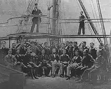 The corvette was transferred to the new Imperial Japanese Navy on 6 June and was the flagship (and the most powerful ship) of the navy until the completion of the ironclad Fusō in 1878.[14] Ryūjō sailed to Yokohama with a British captain shortly afterwards.[15][3] Ryūjō was inspected by Emperor Meiji during a visit to Yokosuka Naval Arsenal on 21 November 1871 and he was hosted aboard the ship during a tour on 23 May 1872. The Emperor reviewed the fleet during its manoeuvres on 26 October.[14][3][16] The ship participated in exercises off the island of Sarushima in Tokyo Bay on 19 January 1873 and escorted Foreign Minister Soejima Taneomi on his mission to Imperial China later in the year to demand recompense for the murders of Japanese sailors by Taiwanese aborigines in 1871. During the Saga Rebellion, the ship played a small role by ferrying the government's commander-in-chief and his staff to nearby Nagasaki in March 1874. Later that year she hosted the Home Minister Ōkubo Toshimichi.[14]