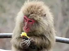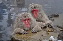 The Japanese macaque (Macaca fuscata), also known as the snow monkey, is a terrestrial Old World monkey species that is native to Japan. They get their name "snow monkey" because some live in areas where snow covers the ground for months each year – no other non-human primate is more northern-living, nor lives in a colder climate.[3] Individuals have brownish grey fur, pinkish-red faces, and short tails. Two subspecies are known.[4]