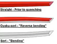 To produce a difference in hardness, the steel is cooled at different rates by controlling the thickness of the insulating layer. By carefully controlling the heating and cooling speeds of different parts of the blade, Japanese swordsmiths were able to produce a blade that had a softer body and a hard edge.[26] This process also has two side effects that have come to characterize Japanese swords: 1.) It causes the blade to curve and 2.) It produces a visible boundary between the hard and soft steel. When quenched, the uninsulated edge contracts, causing the sword to first bend towards the edge. However, the edge cannot contract fully before the martensite forms, because the rest of the sword remains hot and in a thermally expanded state. Because of the insulation, the sword spine remains hot and pliable for several seconds but then contracts much more than the edge, causing the sword to bend away from the edge, which aids the smith in establishing the curvature of the blade. Also, the differentiated hardness and the methods of polishing the steel can result in the hamon 刃紋 (frequently translated as "tempering line" but better translated as "hardening pattern"). The hamon is the visible outline of the yakiba (hardened portion) and is used as a factor to judge both the quality and beauty of the finished blade. The various hamon patterns result from the manner in which the clay is applied. They can also act as an indicator of the style of sword-making and sometimes as a signature for the individual smith. The differences in the hardenability of steels may be enhanced near the hamon, revealing layers or even different parts of the blade, such as the intersection between an edge made from edge-steel and sides made from skin-steel.[27][28]