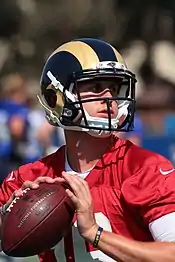 Jared Thomas Goff[1] (born October 14, 1994) is an American football quarterback for the Los Angeles Rams of the National Football League (NFL). He played college football at Cal, where he was a first-team All-Pac-12, and was selected by the Rams as the first overall pick of the 2016 NFL Draft.