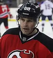 On 22 July 2013, Jágr signed a one-year contract with the New Jersey Devils; the contract included $2 million guaranteed and another $2 million as an incentive bonus if Jágr was to play in at least 40 games.[29] Jágr, at age 41, hoped to help the Devils overcome the loss of Ilya Kovalchuk, who had previously departed for the KHL. Jágr scored his first goal as a Devil on 7 October 2013 in a 5–4 shootout loss to the Edmonton Oilers.[30] The goal came on the 23rd anniversary of his first NHL goal which, coincidentally, was against the Devils.
