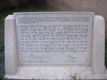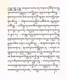 The earliest attested form of Old Javanese can be found in the Sukabumi inscription, which dates from 804 CE.[14] Between the 9th and the 15th century, this form of Javanese flourished in the island of Java. Old Javanese is commonly written in the form of verses. This language variety is also called kawi or 'of poets, poetical', although this term could also be used to refer to the archaic elements of New Javanese literature.[10] The writing system used to write Old Javanese is a descendant of the Pallava script from India.[15] Almost half of the entire vocabularies found in Old Javanese literature are Sanskrit loanwords, although Old Javanese also borrowed terms from other languages in the Maritime Southeast Asia.[10][15]