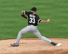 In the 2007 season, Vázquez exceeded the two hundred strikeouts mark for the third time in his career, with the other two occasions being in 2001 and 2003.[23] This season was the seventh season in his career where he had thrown at least two hundred innings.[24] The only season that he was not able to work this quantity of innings was in 2004 when Joe Torre, then manager of the New York Yankees decided to jump some turns in the team's rotation.[25] Vázquez culminated that year with 198 thrown innings.[26] When asked about Javier's performance during the season in an interview, White Sox manager Ozzie Guillén noted that Vázquez had been throwing well for some time but the team had not been able to capitalize on this until it was too late in the season, specifically referring to the team's performance during the summer.[27][28]