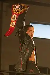 White left for Japan on New Year's Eve 2014, began further training as a young lion upon his arrival, and made his debut for NJPW on 30 January 2015, losing to Alex Shelley.[8] White lost all but eight of his matches in 2015, as is common for young lions in NJPW. In 2016, White began gaining more victories, and on 27 March competed in his biggest match to date when he was defeated by then-reigning IWGP Intercontinental Champion Kenny Omega in a non-title match.[9] White's final match in NJPW took place on 19 June 2016 at Dominion 6.19 in Osaka-jo Hall, when he, David Finlay, and Juice Robinson were defeated by Satoshi Kojima, Hiroyoshi Tenzan, and Manabu Nakanishi.[10] White left for his excursion to the United States the following week.