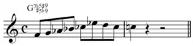 The jazz minor scale contains all of the altered notes of the dominant seventh chord whose root is a semitone below the scale's tonic: "In other words to find the correct jazz minor scale for any dominant 7th chord simply use the scale whose tonic note is a half step higher than the root of the chord."[1] For example, the G7 chord and A♭ jazz minor scale: the A♭ scale contains the root, third, seventh, and the four most common alterations of G7. This scale may be used to resolve to C in the progression G7–C (over G7, which need not be notated G7♭5♯5♭9♯9).[1]
